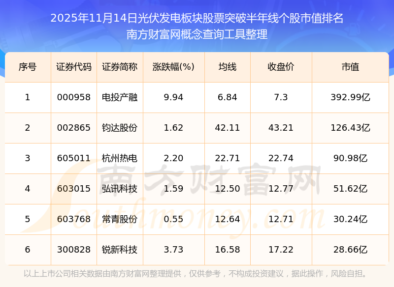 根據(jù)南方財(cái)富網(wǎng)概念查詢工具數(shù)據(jù)統(tǒng)計(jì),截止2025年11月14日收盤,光伏發(fā)電板塊股票共有6只個(gè)股收盤價(jià)向上突破了半年線。其中市值較大的個(gè)股有電投產(chǎn)融、鈞達(dá)股份、杭州熱電等,市值分別為392.99億、126.43億、90.98億。