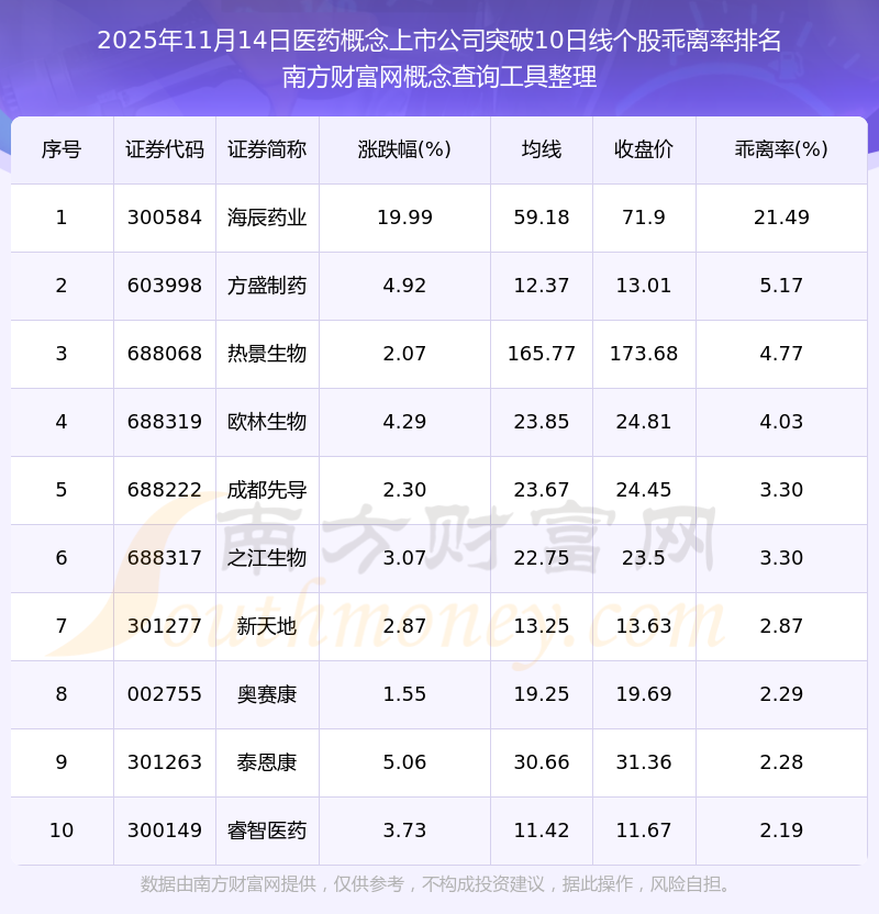 2025年11月14日醫(yī)藥概念上市公司突破10日線個股乖離率排名