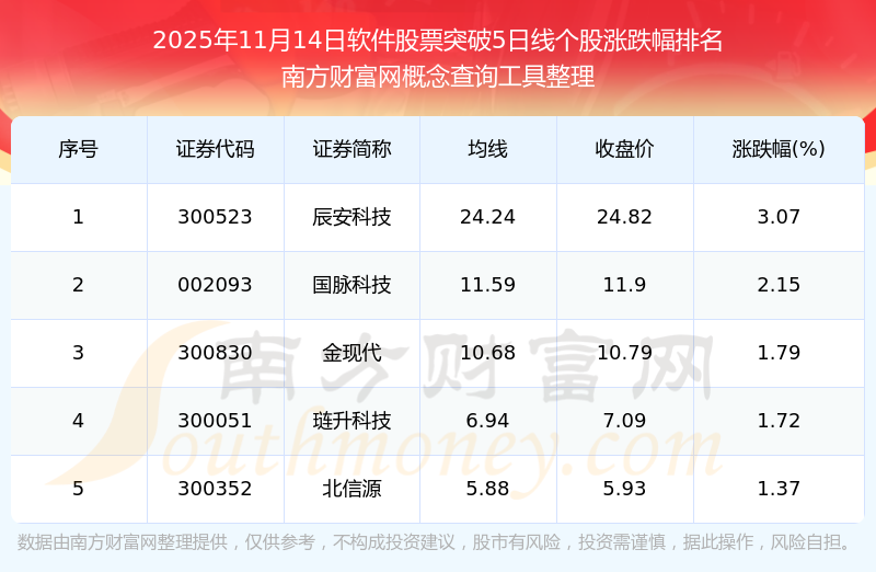 2025年11月14日軟件股票突破5日線個股漲跌幅排名