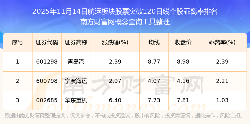 2025年11月14日航運(yùn)板塊股票突破120日線個股乖離率排名