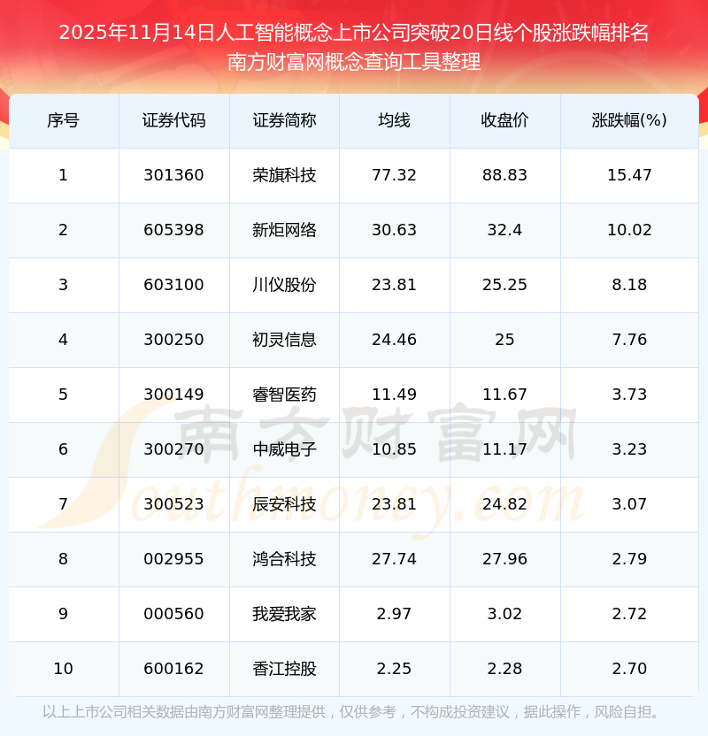 根據南方財富網概念查詢工具數據統(tǒng)計,截止2025年11月14日收盤,人工智能概念上市公司共有18只個股收盤價向上突破了20日線。其中漲幅較大的個股有榮旗科技、新炬網絡、川儀股份等,漲幅分別為15.47%、10.02%、8.18%。