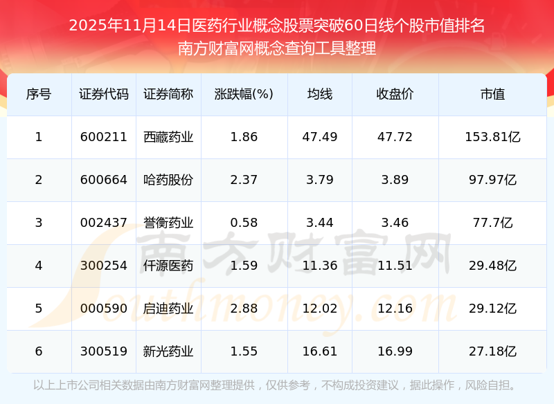 根據(jù)南方財富網(wǎng)概念查詢工具數(shù)據(jù)統(tǒng)計,截止2025年11月14日收盤,醫(yī)藥行業(yè)概念股票共有6只個股收盤價向上突破了60日線。其中市值較大的個股有西藏藥業(yè)、哈藥股份、譽衡藥業(yè)等,市值分別為153.84億、98.22億、77.7億。