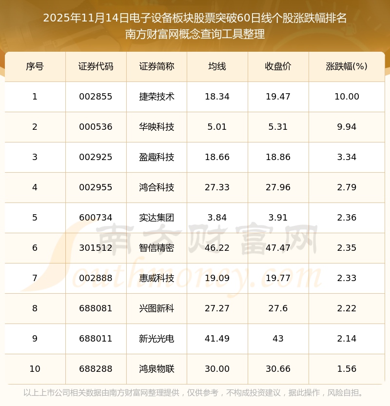 2025年11月14日電子設備板塊股票突破60日線個股漲跌幅排名