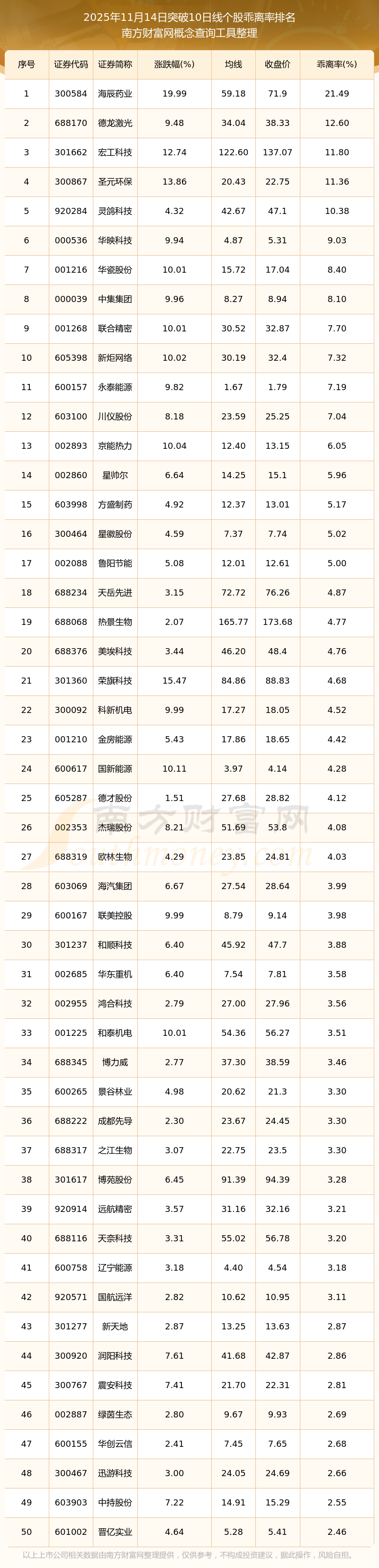 2025年11月14日突破10日線個(gè)股乖離率排名