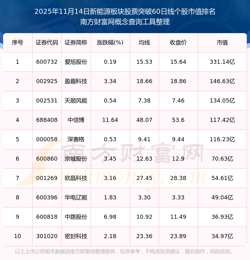 2025年11月14日新能源板塊股票突破60日線個(gè)股市值排名