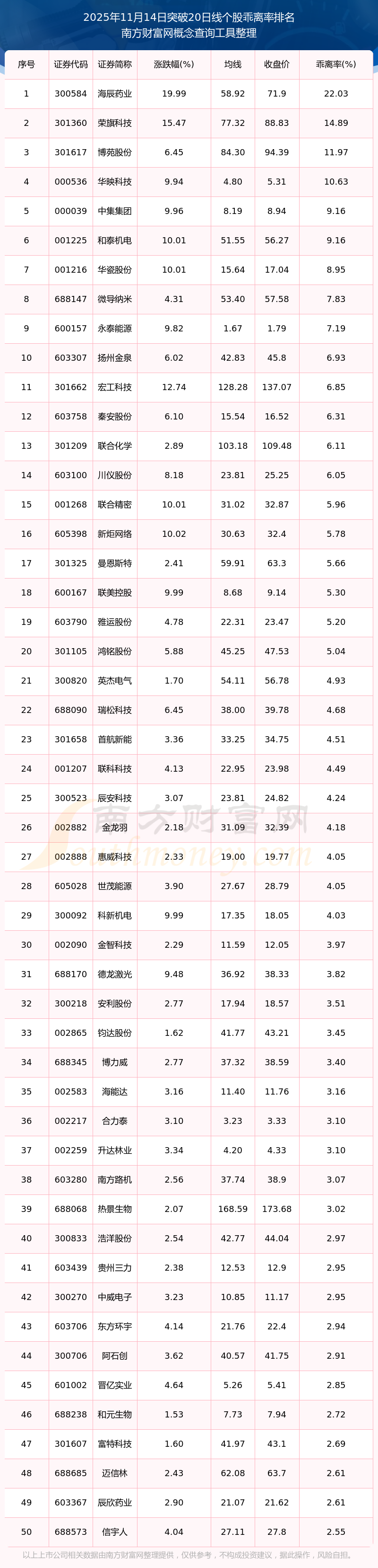 2025年11月14日突破20日線個(gè)股乖離率排名