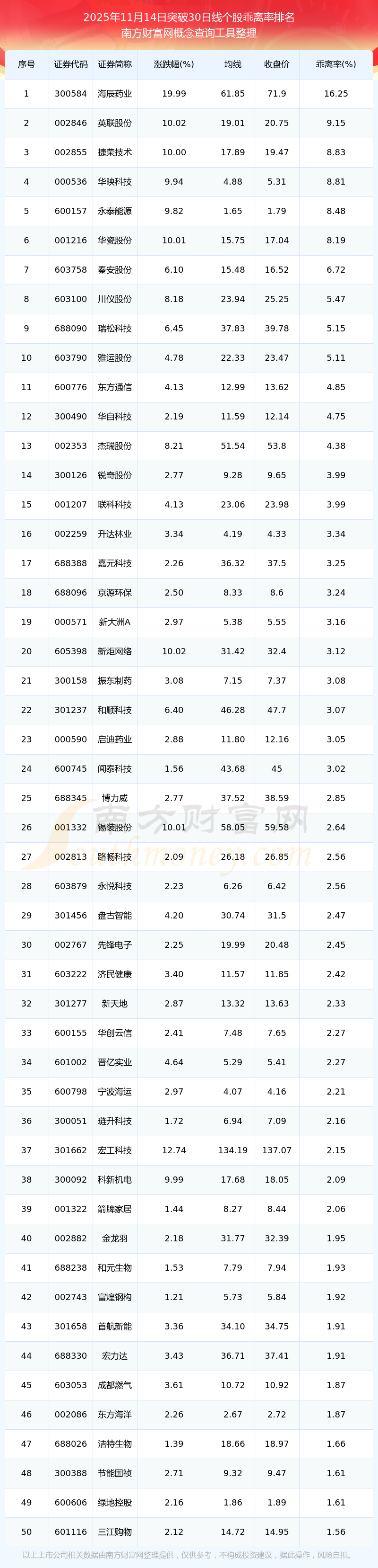 根據(jù)南方財(cái)富網(wǎng)概念查詢工具數(shù)據(jù)統(tǒng)計(jì),截止2025年11月14日收盤,共有103只個股收盤價(jià)向上突破了30日線,其中乖離率較大的個股有海辰藥業(yè)、英聯(lián)股份、捷榮技術(shù)、華映科技、永泰能源等,乖離率分別為16.25%、9.15%、8.83%、8.81%、8.48%。