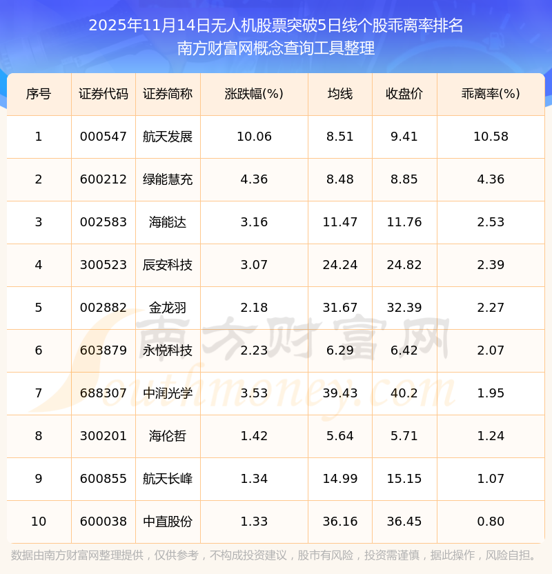 根據(jù)南方財(cái)富網(wǎng)概念查詢工具數(shù)據(jù)統(tǒng)計(jì),截止2025年11月14日收盤,無人機(jī)股票共有13只個(gè)股收盤價(jià)向上突破了5日線。其中乖離率較大的個(gè)股有航天發(fā)展、綠能慧充、海能達(dá)等,乖離率分別為10.58%、4.36%、2.53%。