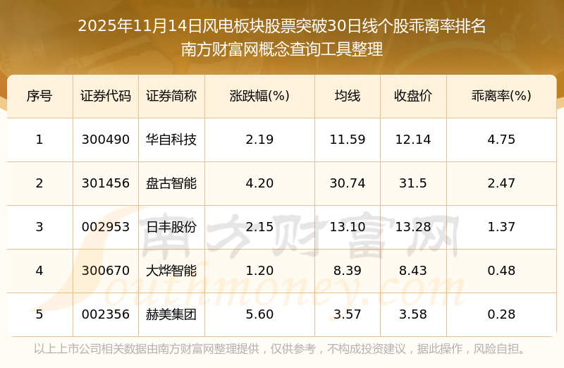 2025年11月14日風電板塊股票突破30日線個股乖離率排名