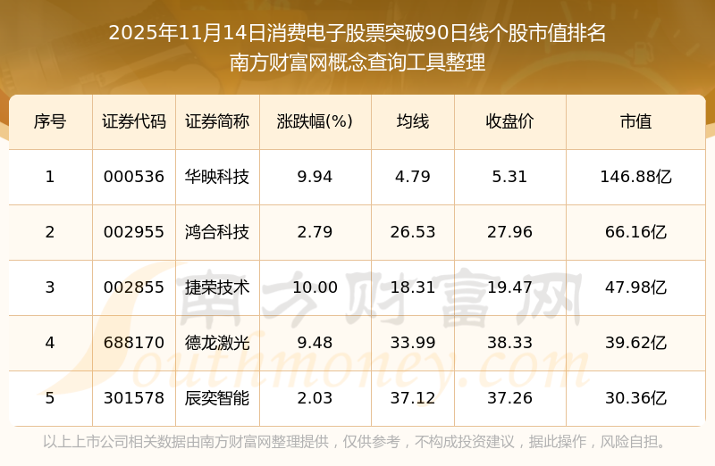 2025年11月14日消費(fèi)電子股票突破90日線個(gè)股市值排名