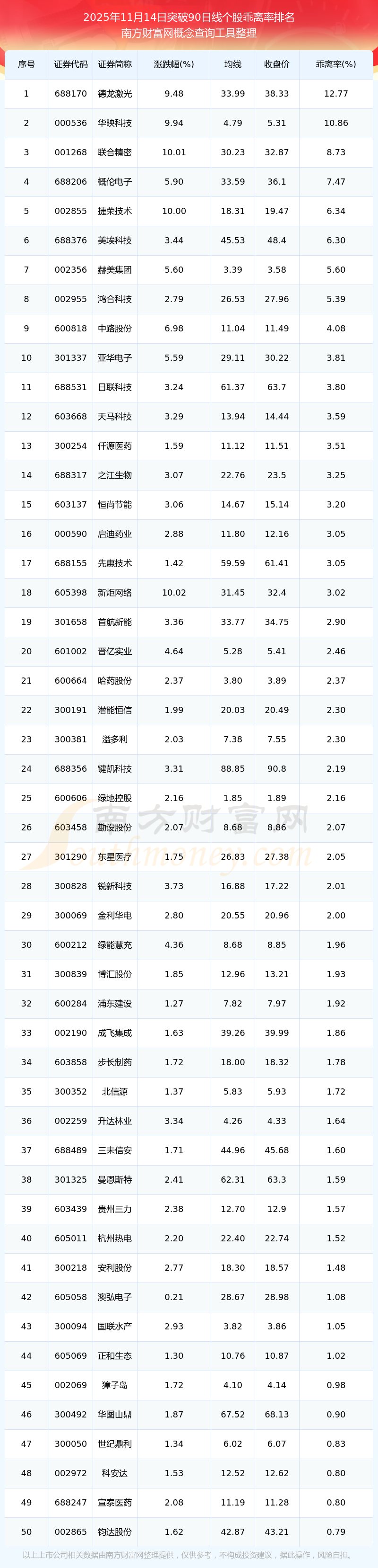 2025年11月14日突破90日線個(gè)股乖離率排名