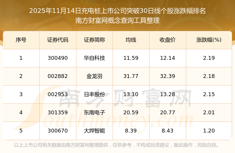 2025年11月14日充電樁上市公司突破30日線個(gè)股漲跌幅排名