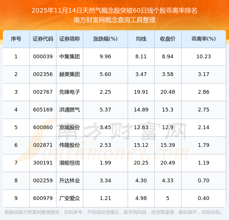 2025年11月14日天然氣概念股突破60日線個(gè)股乖離率排名