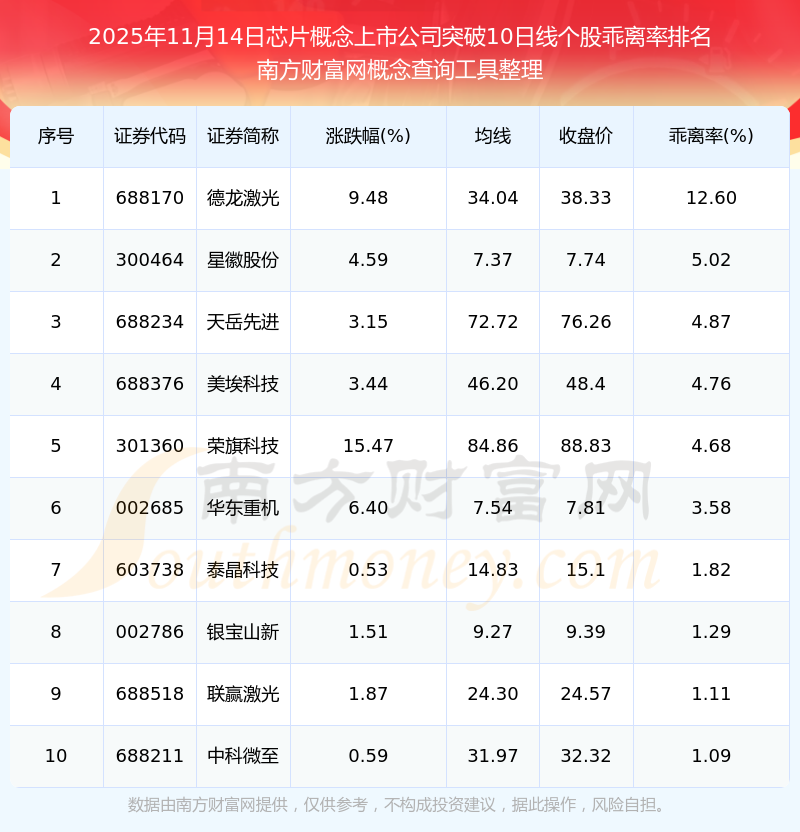 2025年11月14日芯片概念上市公司突破10日線個股乖離率排名