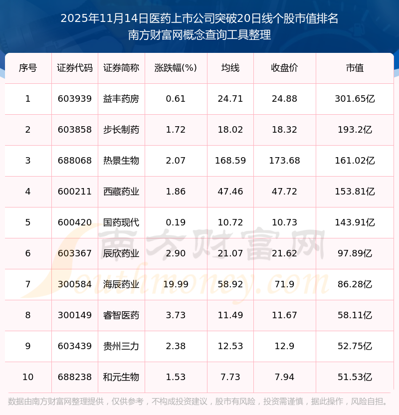 2025年11月14日醫(yī)藥上市公司突破20日線個股市值排名