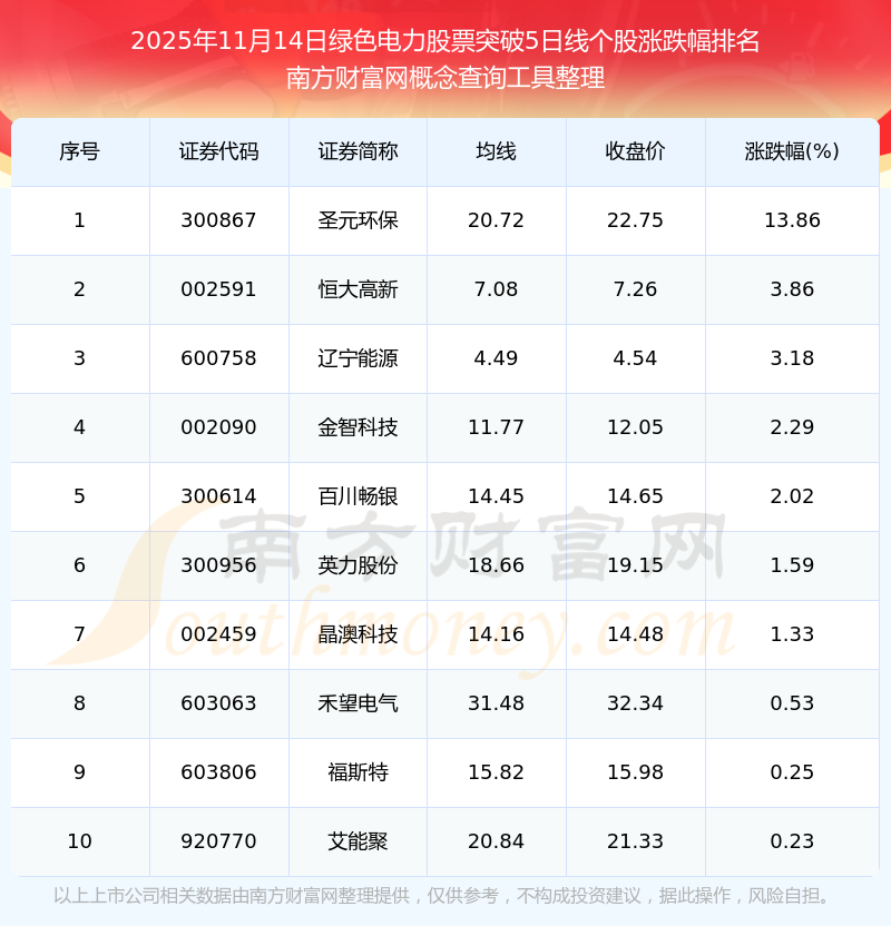 2025年11月14日綠色電力股票突破5日線個股漲跌幅排名