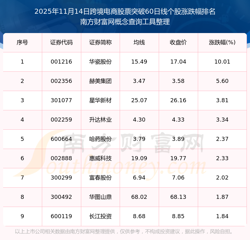 根據(jù)南方財富網(wǎng)概念查詢工具數(shù)據(jù)統(tǒng)計,截止2025年11月14日收盤,跨境電商股票共有9只個股收盤價向上突破了60日線。其中漲幅較大的個股有華瓷股份、赫美集團、星華新材等,漲幅分別為10.01%、5.60%、3.81%。