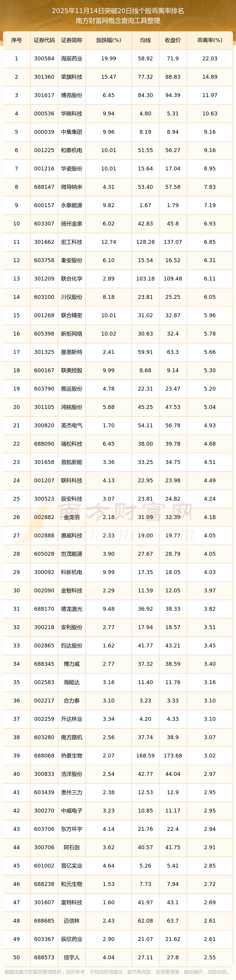 根據(jù)南方財富網(wǎng)概念查詢工具數(shù)據(jù)統(tǒng)計,截止2025年11月14日收盤,共有108只個股收盤價向上突破了20日線,其中乖離率較大的個股有海辰藥業(yè)、榮旗科技、博苑股份、華映科技、中集集團等,乖離率分別為22.03%、14.89%、11.97%、10.63%、9.16%。
