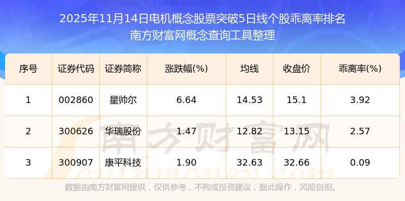 根據南方財富網概念查詢工具數據統(tǒng)計,截止2025年11月14日收盤,電機概念股票共有3只個股收盤價向上突破了5日線。其中乖離率較大的個股有星帥爾、華瑞股份、康平科技等,乖離率分別為3.92%、2.57%、0.09%。