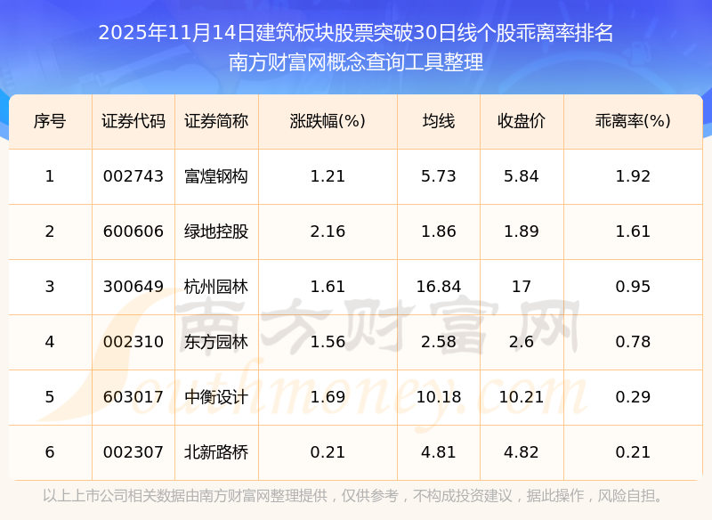 2025年11月14日建筑板塊股票突破30日線個(gè)股乖離率排名