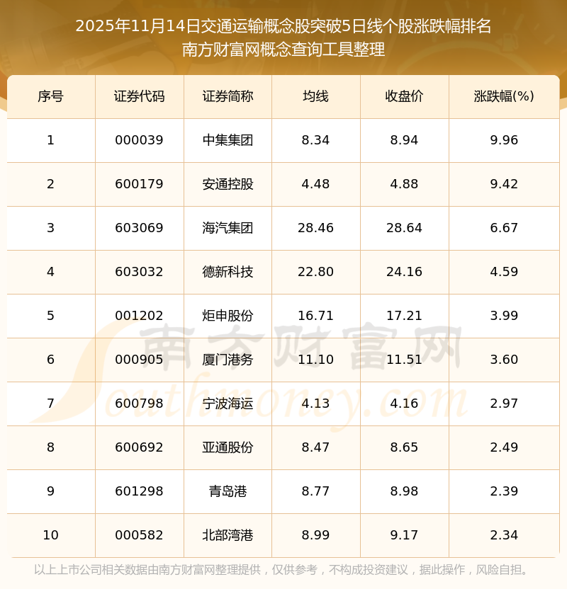 2025年11月14日交通運(yùn)輸概念股突破5日線(xiàn)個(gè)股漲跌幅排名