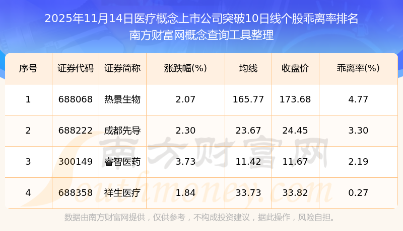 2025年11月14日醫(yī)療概念上市公司突破10日線個股乖離率排名