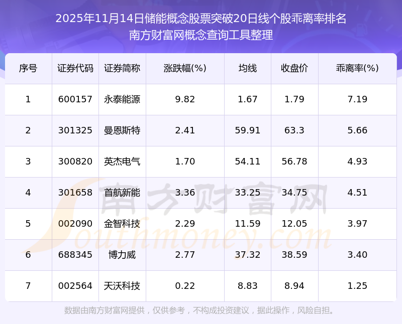 根據(jù)南方財富網(wǎng)概念查詢工具數(shù)據(jù)統(tǒng)計,截止2025年11月14日收盤,儲能概念股票共有7只個股收盤價向上突破了20日線。其中乖離率較大的個股有永泰能源、曼恩斯特、英杰電氣等,乖離率分別為7.19%、5.66%、4.93%。