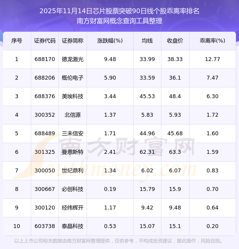 2025年11月14日芯片股票突破90日線個(gè)股乖離率排名