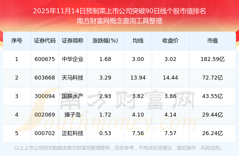 根據(jù)南方財富網(wǎng)概念查詢工具數(shù)據(jù)統(tǒng)計,截止2025年11月14日收盤,預制菜上市公司共有5只個股收盤價向上突破了90日線。其中市值較大的個股有中華企業(yè)、天馬科技、國聯(lián)水產(chǎn)等,市值分別為182.59億、72.72億、43.55億。