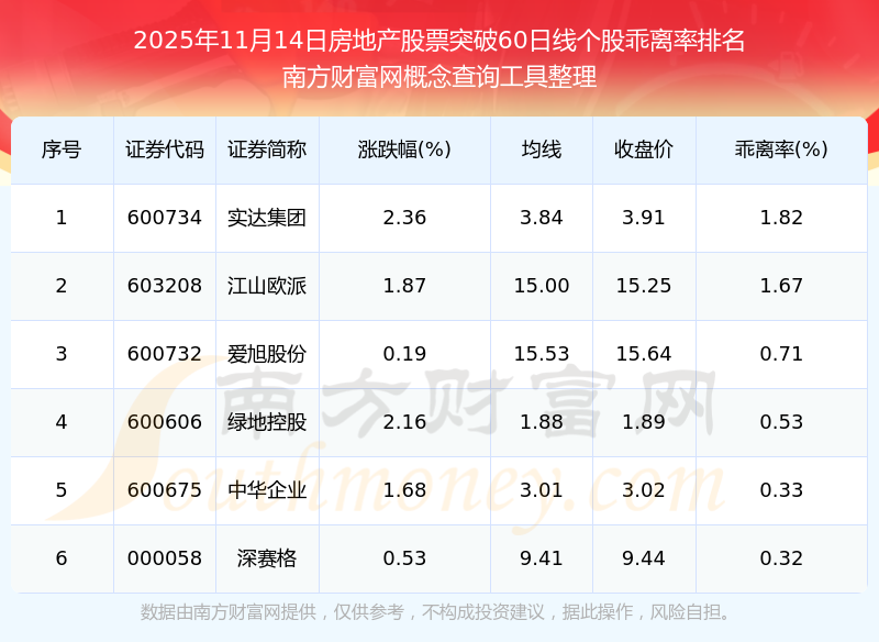 根據(jù)南方財(cái)富網(wǎng)概念查詢工具數(shù)據(jù)統(tǒng)計(jì),截止2025年11月14日收盤,房地產(chǎn)股票共有6只個(gè)股收盤價(jià)向上突破了60日線。其中乖離率較大的個(gè)股有實(shí)達(dá)集團(tuán)、江山歐派、愛旭股份等,乖離率分別為1.82%、1.67%、0.71%。