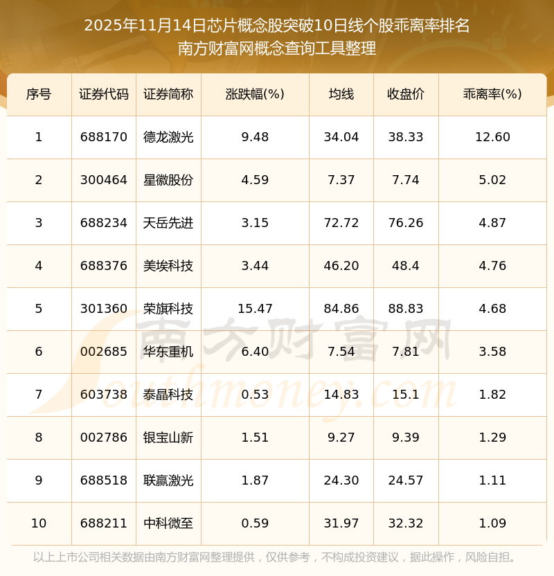2025年11月14日芯片概念股突破10日線個(gè)股乖離率排名