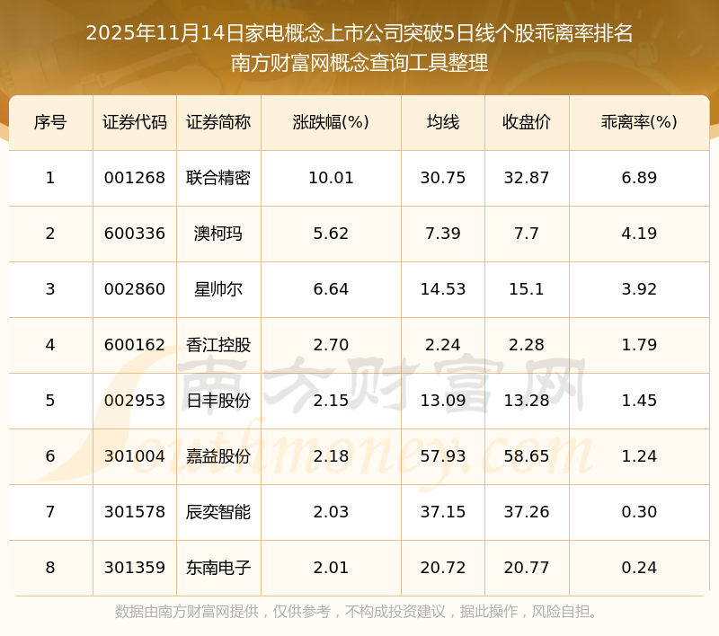 2025年11月14日家電概念上市公司突破5日線個(gè)股乖離率排名