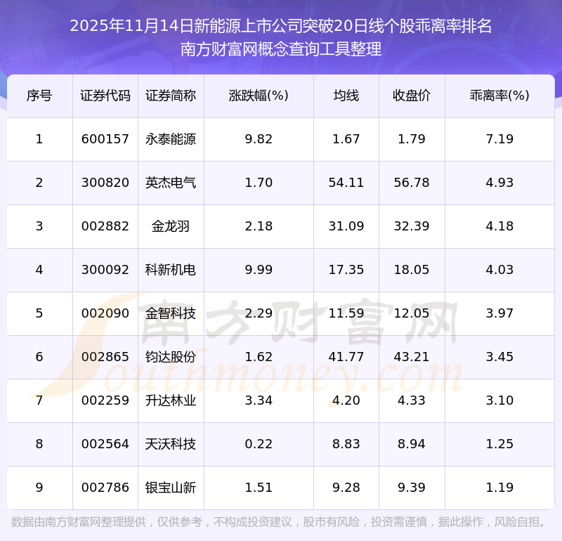 根據(jù)南方財富網(wǎng)概念查詢工具數(shù)據(jù)統(tǒng)計,截止2025年11月14日收盤,新能源上市公司共有9只個股收盤價向上突破了20日線。其中乖離率較大的個股有永泰能源、英杰電氣、金龍羽等,乖離率分別為7.19%、4.93%、4.18%。