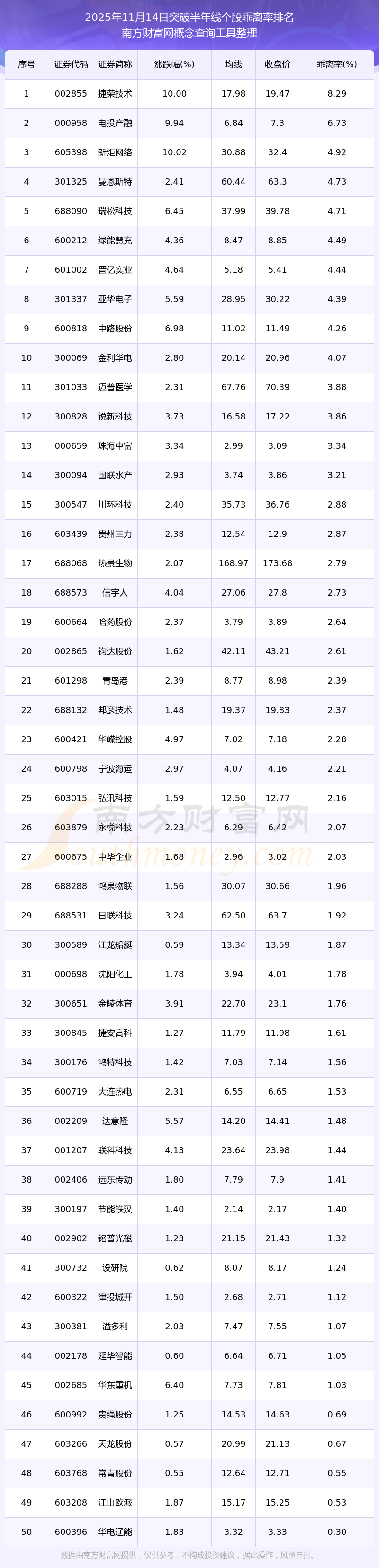 根據(jù)南方財富網(wǎng)概念查詢工具數(shù)據(jù)統(tǒng)計,截止2025年11月14日收盤,共有56只個股收盤價向上突破了半年線,其中乖離率較大的個股有捷榮技術、電投產融、新炬網(wǎng)絡、曼恩斯特、瑞松科技等,乖離率分別為8.29%、6.73%、4.92%、4.73%、4.71%。
