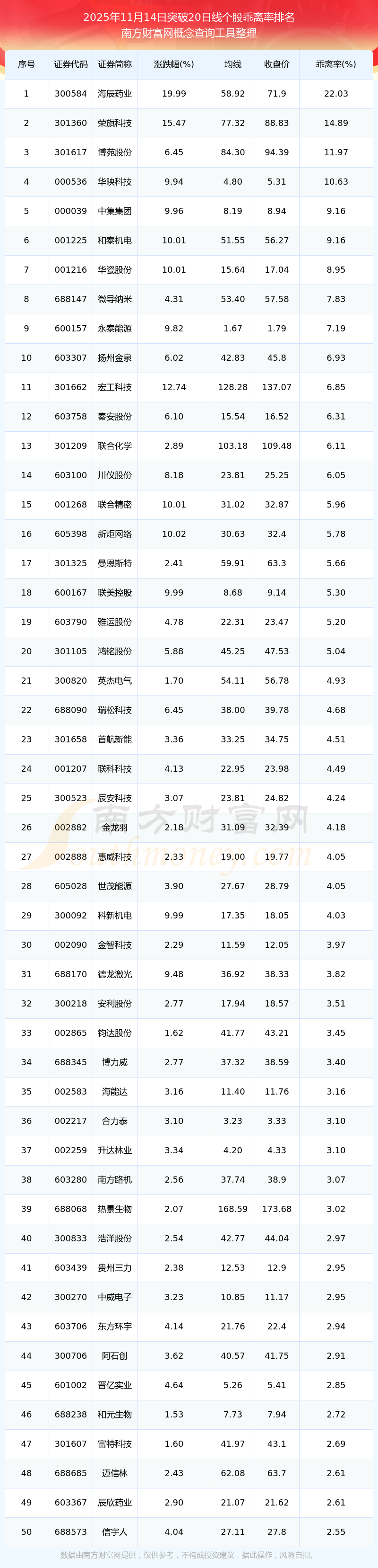 根據(jù)南方財(cái)富網(wǎng)概念查詢工具數(shù)據(jù)統(tǒng)計(jì),截止2025年11月14日收盤,共有108只個股收盤價向上突破了20日線,其中乖離率較大的個股有海辰藥業(yè)、榮旗科技、博苑股份、華映科技、中集集團(tuán)等,乖離率分別為22.03%、14.89%、11.97%、10.63%、9.16%。