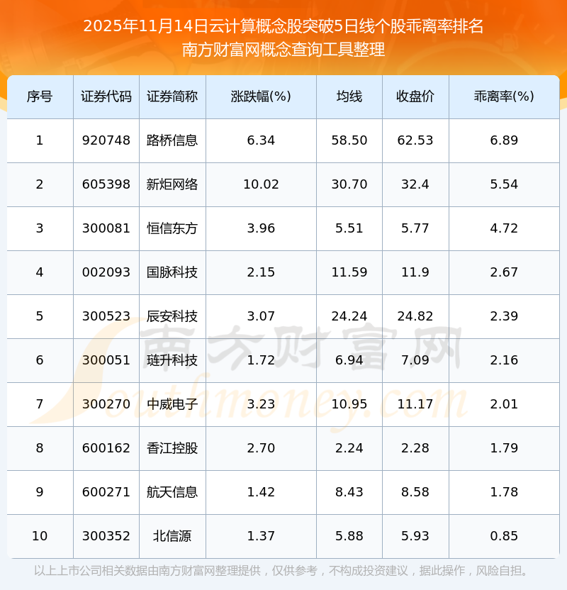 根據(jù)南方財富網(wǎng)概念查詢工具數(shù)據(jù)統(tǒng)計,截止2025年11月14日收盤,云計算概念股共有12只個股收盤價向上突破了5日線。其中乖離率較大的個股有路橋信息、新炬網(wǎng)絡(luò)、恒信東方等,乖離率分別為6.89%、5.54%、4.72%。