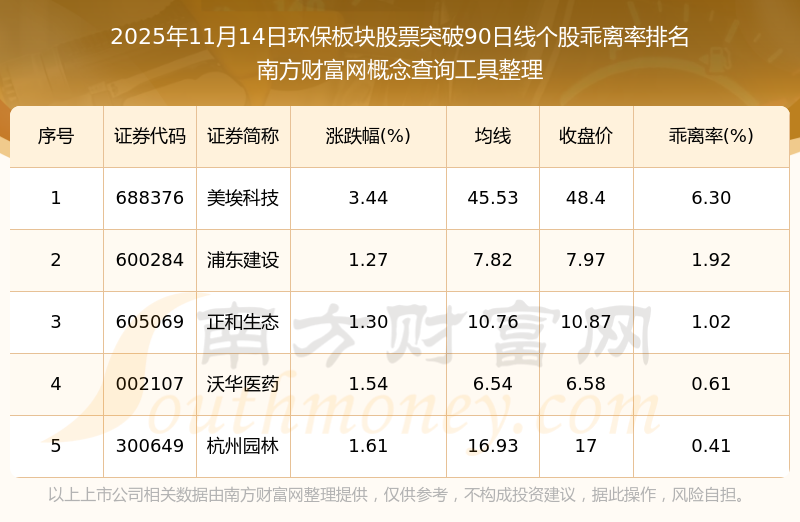 2025年11月14日環(huán)保板塊股票突破90日線個(gè)股乖離率排名