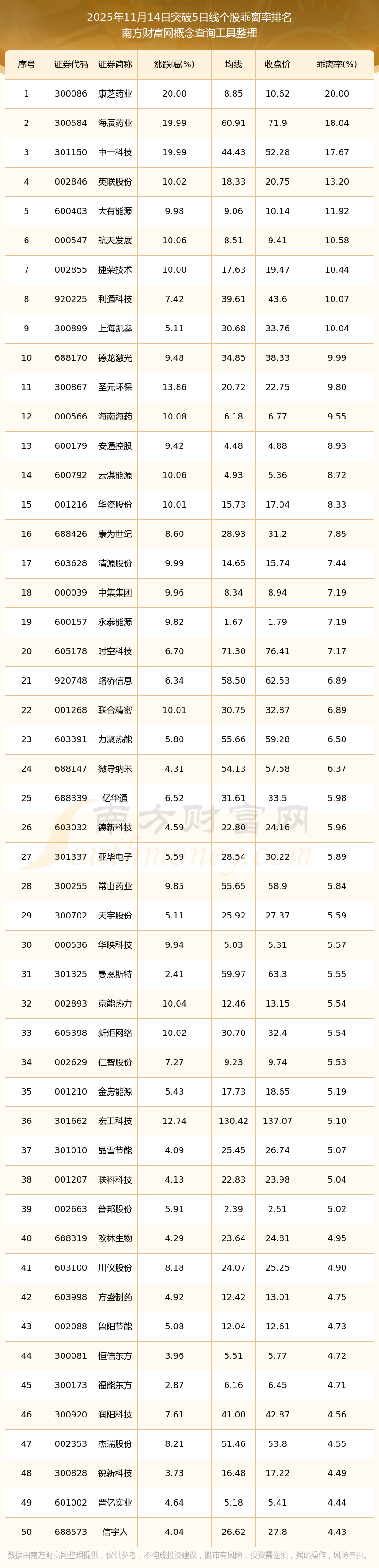 2025年11月14日突破5日線個股乖離率排名