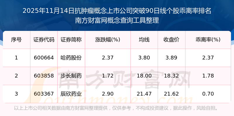 2025年11月14日抗腫瘤概念上市公司突破90日線個股乖離率排名