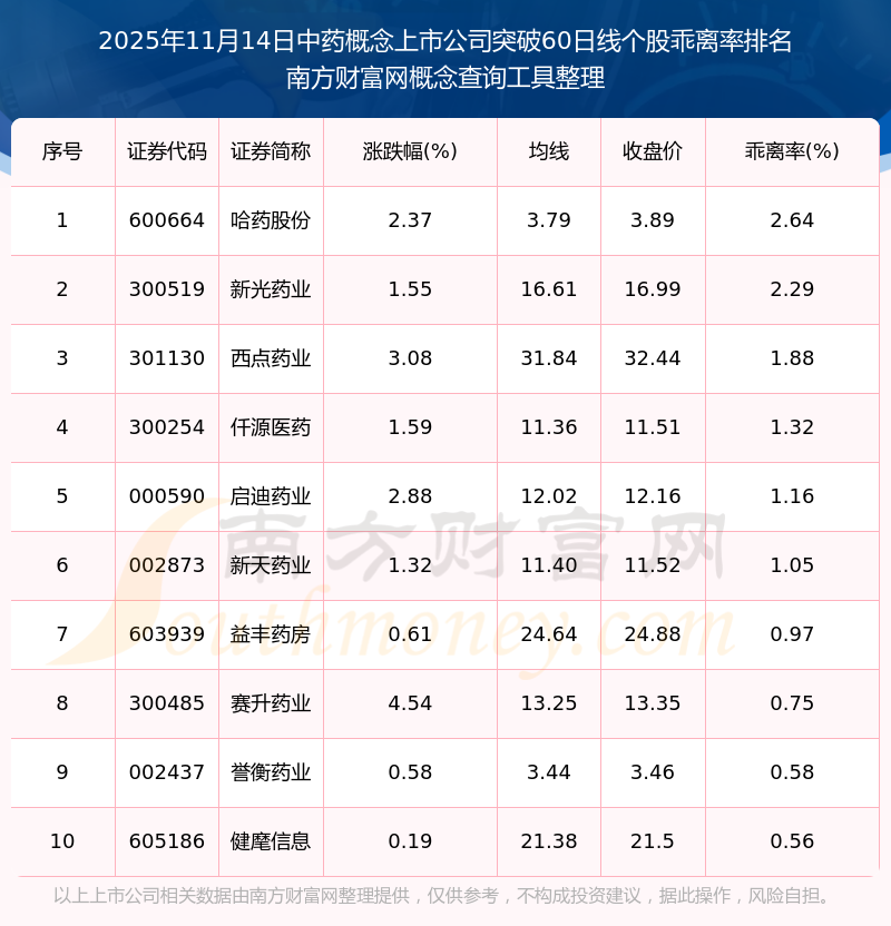 2025年11月14日中藥概念上市公司突破60日線個(gè)股乖離率排名