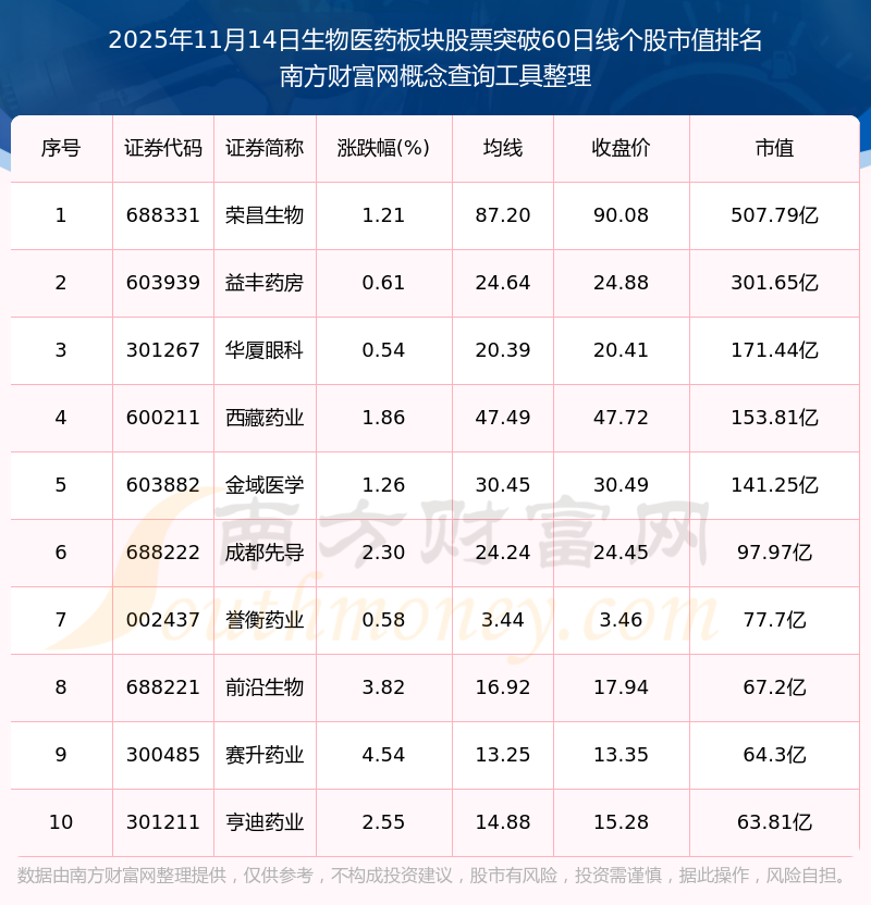 2025年11月14日生物醫(yī)藥板塊股票突破60日線個(gè)股市值排名