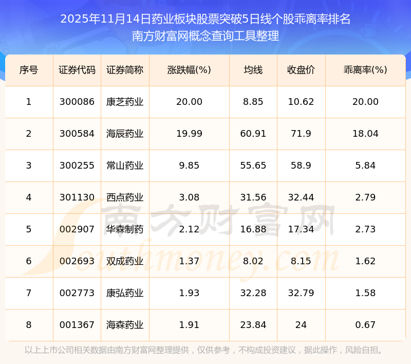 2025年11月14日藥業(yè)板塊股票突破5日線個(gè)股乖離率排名