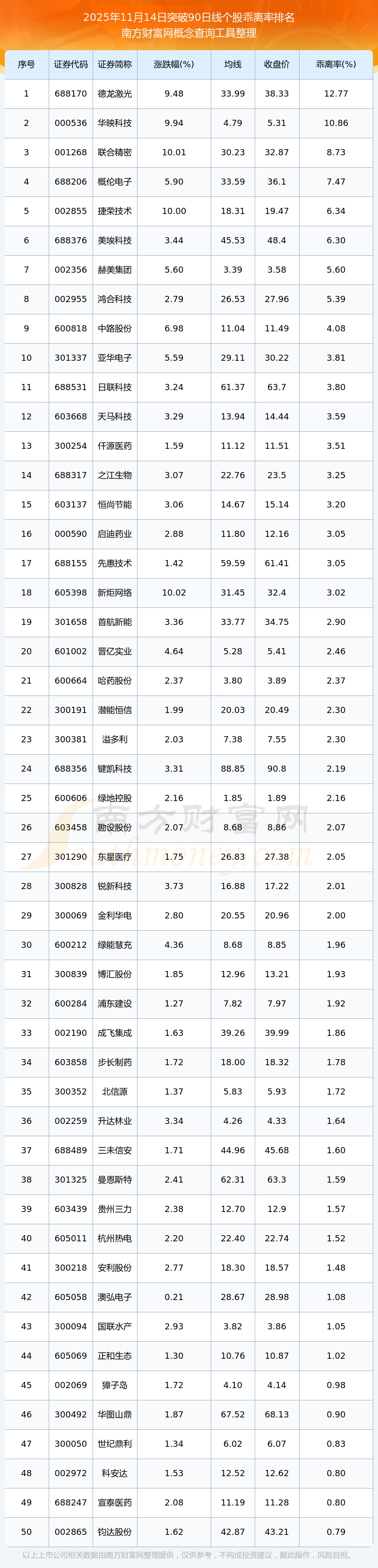 根據(jù)南方財富網(wǎng)概念查詢工具數(shù)據(jù)統(tǒng)計,截止2025年11月14日收盤,共有75只個股收盤價向上突破了90日線,其中乖離率較大的個股有德龍激光、華映科技、聯(lián)合精密、概倫電子、捷榮技術(shù)等,乖離率分別為12.77%、10.86%、8.73%、7.47%、6.34%。