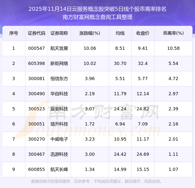 根據(jù)南方財富網概念查詢工具數(shù)據(jù)統(tǒng)計,截止2025年11月14日收盤,云服務概念股共有9只個股收盤價向上突破了5日線。其中乖離率較大的個股有航天發(fā)展、新炬網絡、恒信東方等,乖離率分別為10.58%、5.54%、4.72%。