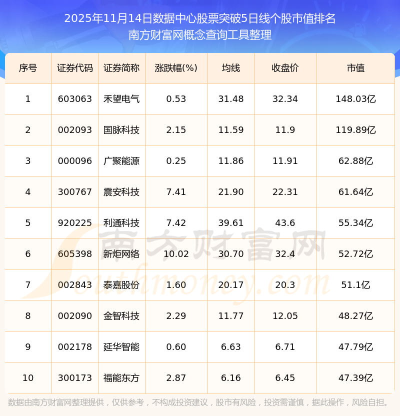 根據(jù)南方財富網(wǎng)概念查詢工具數(shù)據(jù)統(tǒng)計,截止2025年11月14日收盤,數(shù)據(jù)中心股票共有15只個股收盤價向上突破了5日線。其中市值較大的個股有禾望電氣、國脈科技、廣聚能源等,市值分別為148.03億、119.89億、62.88億。
