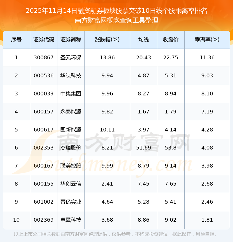 2025年11月14日融資融券板塊股票突破10日線個股乖離率排名