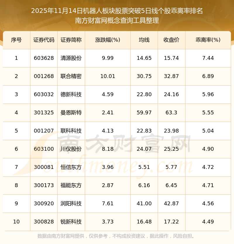 根據(jù)南方財(cái)富網(wǎng)概念查詢工具數(shù)據(jù)統(tǒng)計(jì),截止2025年11月14日收盤,機(jī)器人板塊股票共有44只個(gè)股收盤價(jià)向上突破了5日線。其中乖離率較大的個(gè)股有清源股份、聯(lián)合精密、德新科技等,乖離率分別為7.44%、6.89%、5.96%。