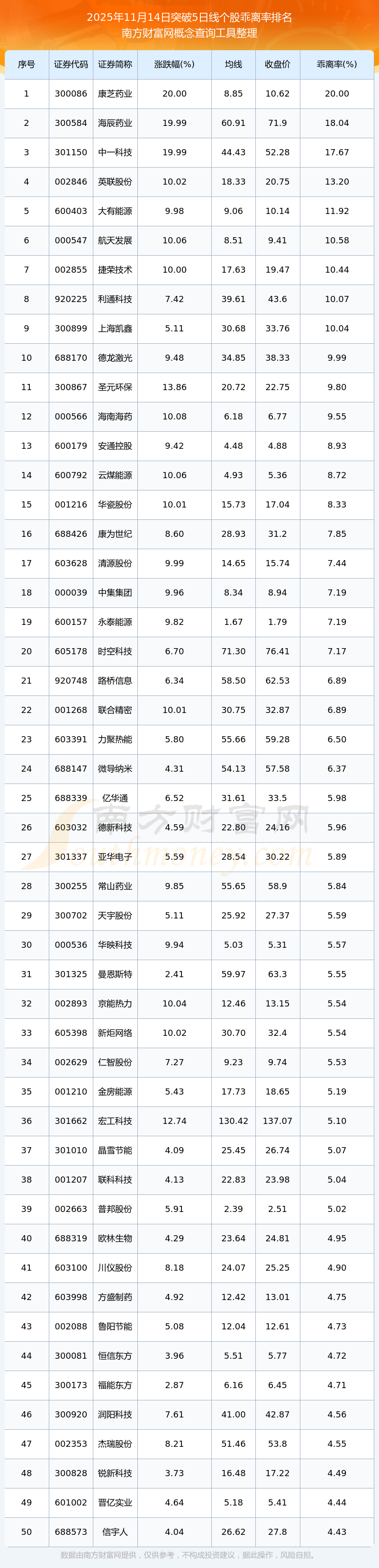 2025年11月14日突破5日線個股乖離率排名