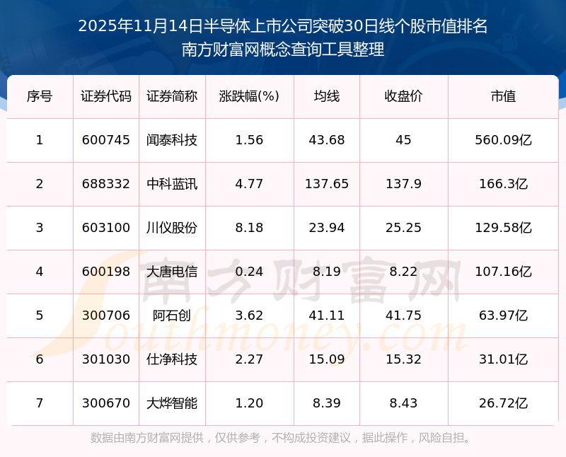 2025年11月14日半導(dǎo)體上市公司突破30日線個(gè)股市值排名