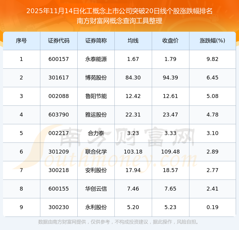 根據南方財富網概念查詢工具數(shù)據統(tǒng)計,截止2025年11月14日收盤,化工概念上市公司共有9只個股收盤價向上突破了20日線。其中漲幅較大的個股有永泰能源、博苑股份、魯陽節(jié)能等,漲幅分別為9.82%、6.45%、5.08%。